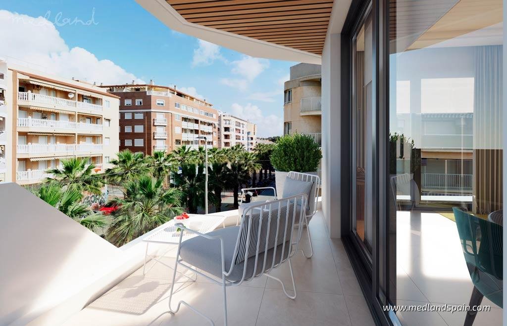New apartment complex only 125m from the beautiful beaches of Guardamar del Segura. This town on the Costa Blanca has a complete selection of daily amenities, available all year ‘round. Guardamar is perfect for nature lovers, with an impressive 11km long beach, sand dunes, and pine forests. Outdoor sports enthusiasts can enjoy various activities, like tennis and padel courts, sports centres and gyms, as well as various golf courses within a 30-minute drive. The area is well connected by road, allowing for quick and easy access to other tourist areas like Torrevieja and Orihuela Costa, Santa Pola, and Alicante between 20-45 minutes’ drive. Alicante airport is only 35 minutes away by car.A modern apartment complex distributed on five floors and comprising apartments with 1, 2, and 3 bedrooms. All apartments have a bright and open plan lounge, dining area and kitchen, with large windows that open onto a terrace. Besides the apartments with 1 bedroom, all master bedrooms have a private bathroom. Depending on the location within the complex, some apartments also enjoy sea views.The apartments include fully installed ducted A/C, kitchens equipped with white goods, fitted wardrobes, electric blinds, and a Smart Home system.The community area is on the roof of the complex, with impressive sea views, as well as a large pool with outdoor shower, and green areas with parasols, ideal for enjoying the Mediterranean climate any time of the year.Considering the privileged location, the included features, and the price, these apartments represent an excellent investment opportunity.