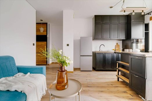 - Salon z aneksem kuchennym i wyjściem na balkon