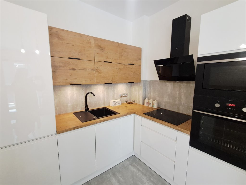 * Kuchnia w zabudowie meblowej wykonanej na wymiar przez stolarza – gwarancja trwałości, estetyki oraz ergonomii. W pełni wyposażona w sprzęt AGD: płyta indukcyjna, piekarnik, mikrofalówka, okap, zmywarka oraz lodówka,