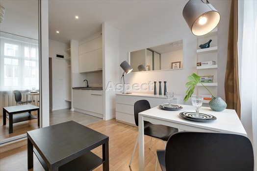 - Salon wyposażony w zabudowaną, dużą szafę z lustrem, które optyczni powiększa przestrzeń, komodę, rozkładaną kanapę oraz część jadalnianą