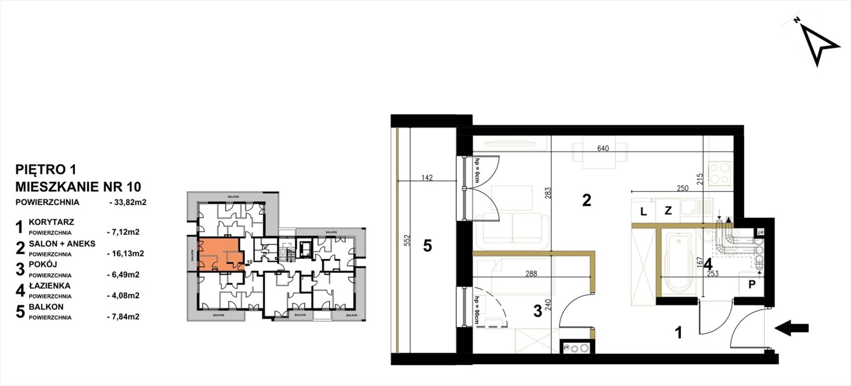 Mieszkanie składa się z sypialni, salonu z aneksem kuchennym, łazienki, korytarza oraz dużego balkonu o powierzchni aż 7,84 m2.