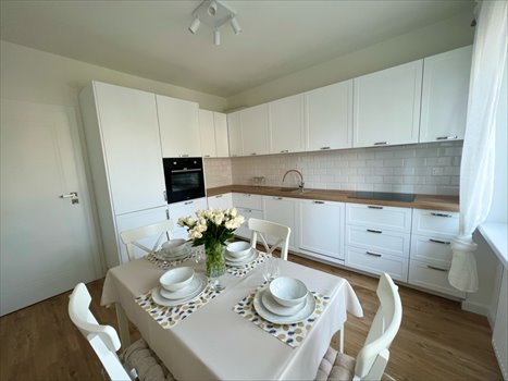 Kuchnia (~12m2): przestronna i nowoczesna kuchnia, w pełni wyposażona - nowy sprzęt AGD (lodówka, zmywarka, piekarnik, kuchenka) wraz z jadalnią (stół, 4 krzesła)