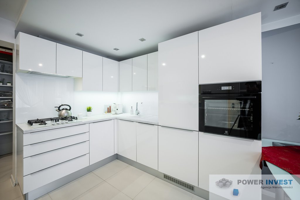 Kuchnia wyposażona jest w nowoczesną zabudowę na wymiar z dużą ilością miejsca do przechowywania oraz systemem cichego domyku Blum. Pełne wyposażenie AGD obejmuje kuchenkę gazową, okap, lodówkę z zamrażalnikiem, nowy piekarnik oraz zmywarkę na gwarancji.