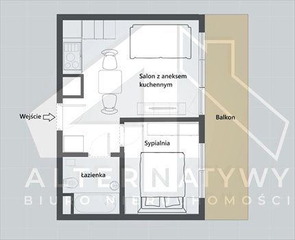 * salon z aneksem kuchennym i wyjściem na przestronny balkon