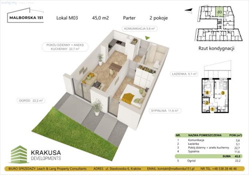 Oferowane mieszkanie oznaczone nr M03, ma powierzchnię 45 m2, znajduje się na parterze nowoczesnego budynku i składa się z:
