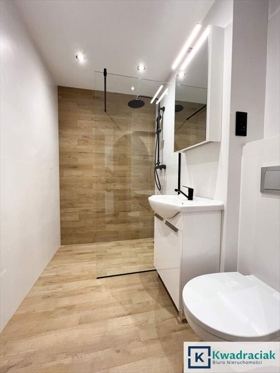 Łazienka została wykończona w wysokim standardzie - znajduje się w niej nowoczesna kabina prysznicowa typu walk-in oraz praktyczne rozwiązania zapewniające komfort codziennego użytkowania.