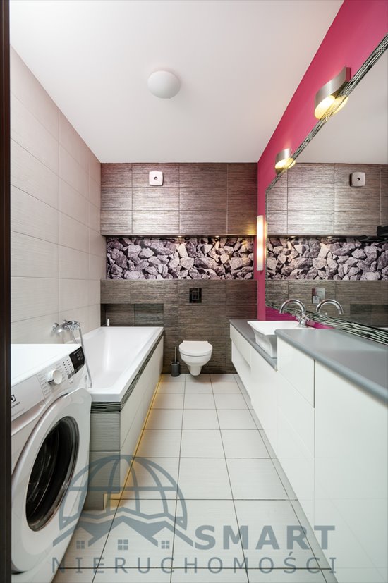 łazienki z ubikacją. Łazienka wyposażona w wannę, pralkę, zlew i półki w zabudowie,