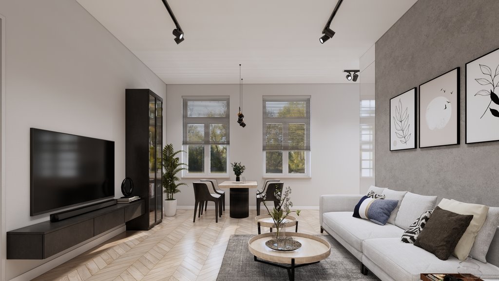 To mieszkanie łączy jedno i drugie - a dodatkowo daje coś, czego w centrum często brakuje: światło i przestrzeń za oknem.
