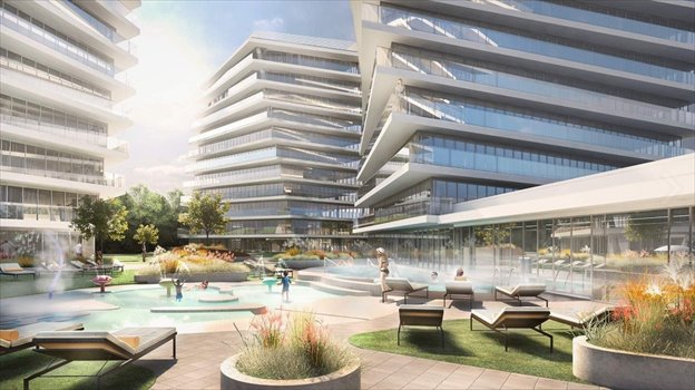 - W centralnej część kompleksu znajdzie się strefa SPA i saunarium oraz strefa basenowa wyposażona w leżaki, brodziki, jacuzzi zewnętrzne, wodotryski oraz strefę relaksu,