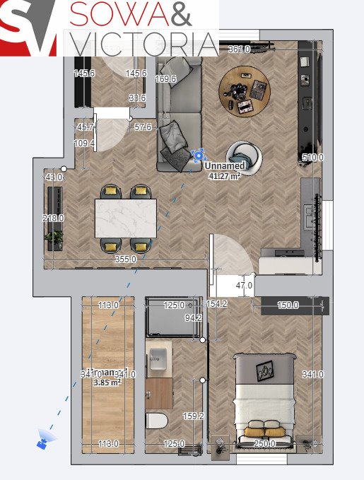 Funkcjonalny: salon z aneksem kuchennym plus dwie sypialnie, łazienka i przedpokój.