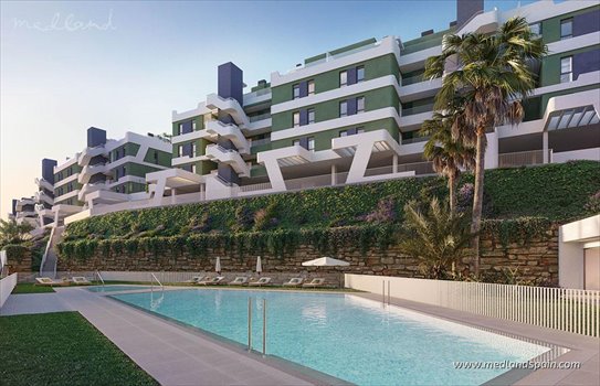 Exclusive frontline golf apartments with sea views in Mijas Costa. It is the perfect location, surrounded by nature, and close to beautiful beaches, like La Cala de Mijas, which is only 8 minutes away. All the necessary services are also close by, like shopping centres, supermarkets, a medical centre, banks and restaurants. It is also ideal for outdoor sports enthusiast, with various golf courses within a 10km radius, incl. "Calanova Golf Club and the "Chaparral Golf Club", as well as a wide range of adventure sports, like paragliding or water activities in general. The complex is perfectly connected to other tourist attractions, thanks to the AP-7 and A-7 motorways, like Puerto Banús in 30 minutes, the historic centre of Marbella and Fuengirola in 25 minutes, and Malaga with its airport in 40 minutes.Apartments with 2 and 3 bedrooms, available in various models: ground floor apartments with a private garden, mid-floor apartments with a terrace, and penthouses with a large terrace. The apartments have an open plan living area, where the kitchen, dining area and lounge are combined in a large space, with floor-to-ceiling windows opening onto the fantastic terrace. This design ensures that each apartment enjoys the almost 320 days of sunshine the Costa del Sol offers, as well as magnificent panoramic views of the sea and the coast of Malaga. All apartments include kitchens fully equipped with white goods, ducted hot/cold air conditioning, fitted wardrobes, and parking.The complex is completely closed, with security access and remote-controlled automatic gate. The community facilities include a large salt-water pool for adults and children, surrounded by an area for sun loungers, a fully equipped gym with showers and a sauna, a co-working space, and beautiful garden spaces.