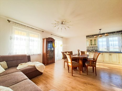 Pokój z aneksem kuchennym: Przestronny i jasny pokój połączony z nowoczesnym aneksem kuchennym, który tworzy otwartą i funkcjonalną przestrzeń idealną do codziennego użytku oraz przyjmowania gości.
