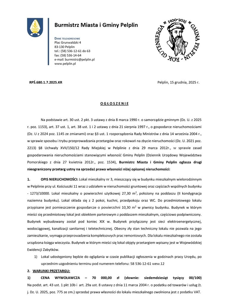15) Niniejsze ogłoszenie podlega wywieszeniu na tablicy ogłoszeń w siedzibie Urzędu Miasta i Gminy na okres od dnia 15 grudnia 2025 r. do dnia 16 stycznia 2026 r., oraz na stronie internetowej bip.pelplin.pl.