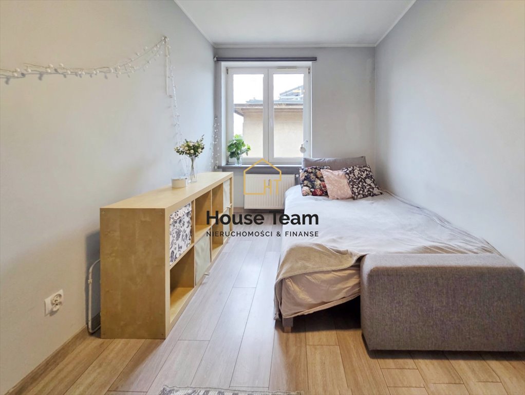 Drugi pokój pełni obecnie funkcję przestronnej sypialni. W cenie pozostają narożnik z funkcją spania oraz biała szafa ubraniowa.