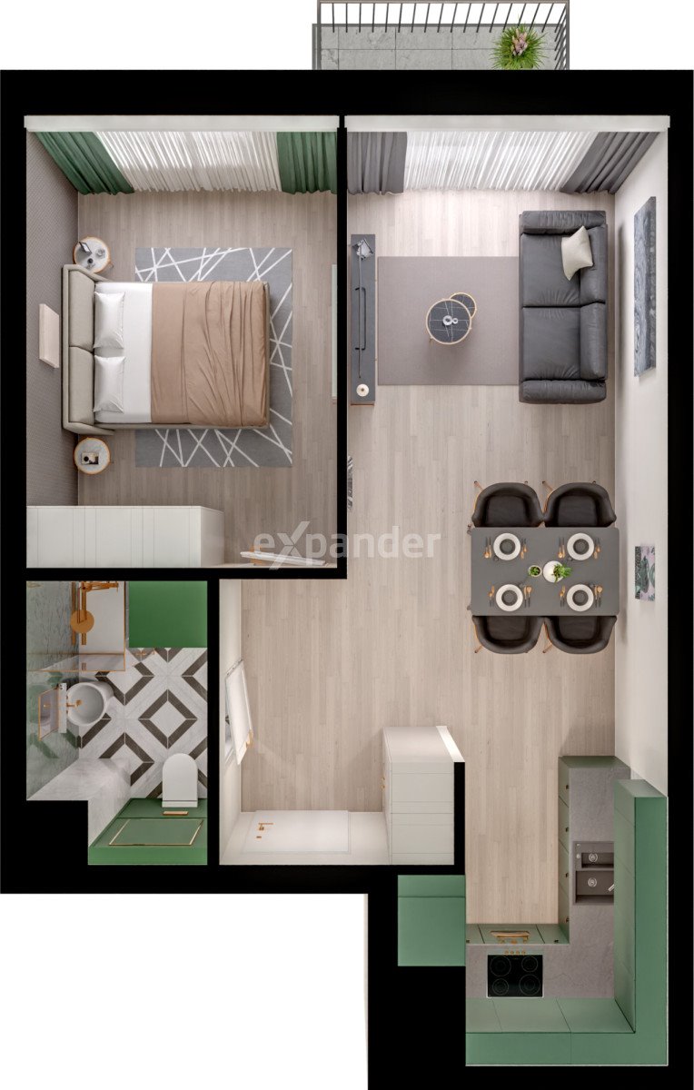 Mieszkanie posiada bardzo dobry, regularny układ - salon z aneksem kuchennym i wyjściem na balkon, ustawna sypialnia, łazienka oraz funkcjonalny przedpokój. Duże przeszklenia zapewniają dobre doświetlenie wnętrz.
