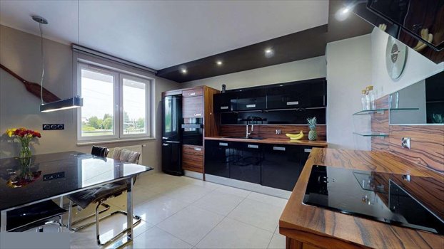 kuchnia otwarta na salon – wykonana na wymiar, w pięknym stylu, w pełni wyposażona w sprzęt AGD (lodówka, piekarnik, płyta, okap, zmywarka),