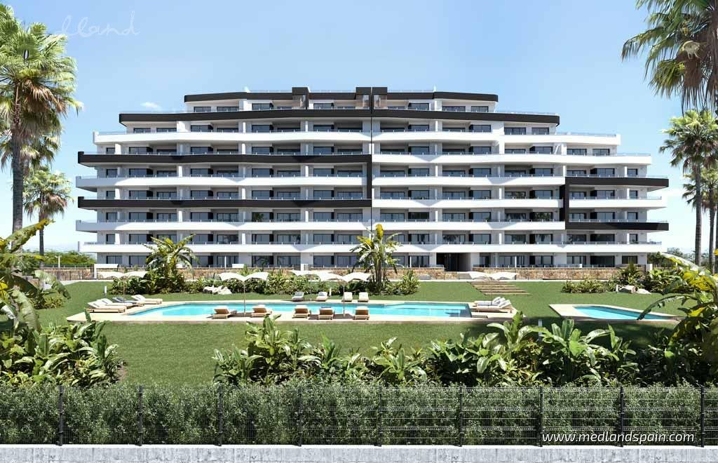 Located only a stone’s through from the centre of San Miguel de Salinas, in the heart of the Costa Blanca. This town embodies the perfect blend of traditional Spanish charm and modern convenience, with stunning views of the salt lagoons of Torrevieja and La Mata. Enjoy easy access to everyday services like supermarkets, restaurants, cafés, and health centres, all within walking distance. Sports enthusiasts have a choice of outdoor activities available close by, as well as a variety of golf courses. The excellent road network makes exploring the coast a breeze, only 10 minutes from the golden beaches of Orihuela Costa, 15 minutes from the bustling town of Torrevieja, and less than an hour to both Alicante and Murcia airports.This modern apartment complex has been designed for comfortable living, with each apartment having a practical design, and featuring 2 bedrooms and 2 bathrooms, an open plan living area, and an en-suite master bedroom. Choose between different models to suit any lifestyle:• Ground-floor models with a private garden• Mid-floor models with a spacious terrace, or a larger corner terrace• Penthouses with a large corner terrace, or a private solariumEach apartment is equipped with the highest quality finishes, and, for a limited time, will include furniture, ducted A/C, white goods, fitted wardrobes, electric blinds, a storage room, and a parking space. Ask your advisor for details!This gated complex offers fantastic community areas designed for relaxation, with a pool for adult and one for children, accessible landscaped gardens, a children’s playground, and a petanque terrain—ideal for outdoor enjoyment with family and friends. This complex provides a comfortable and secure environment in a privileged location.Don’t miss this opportunity to enjoy an exceptional home, in a charming atmosphere, close to all amenities, and well connected to both airports, ideal for holiday visits, for permanent living, or for a smart investment.