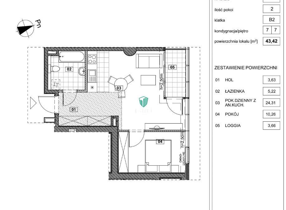 - Powierzchnia całkowita43,42 m2