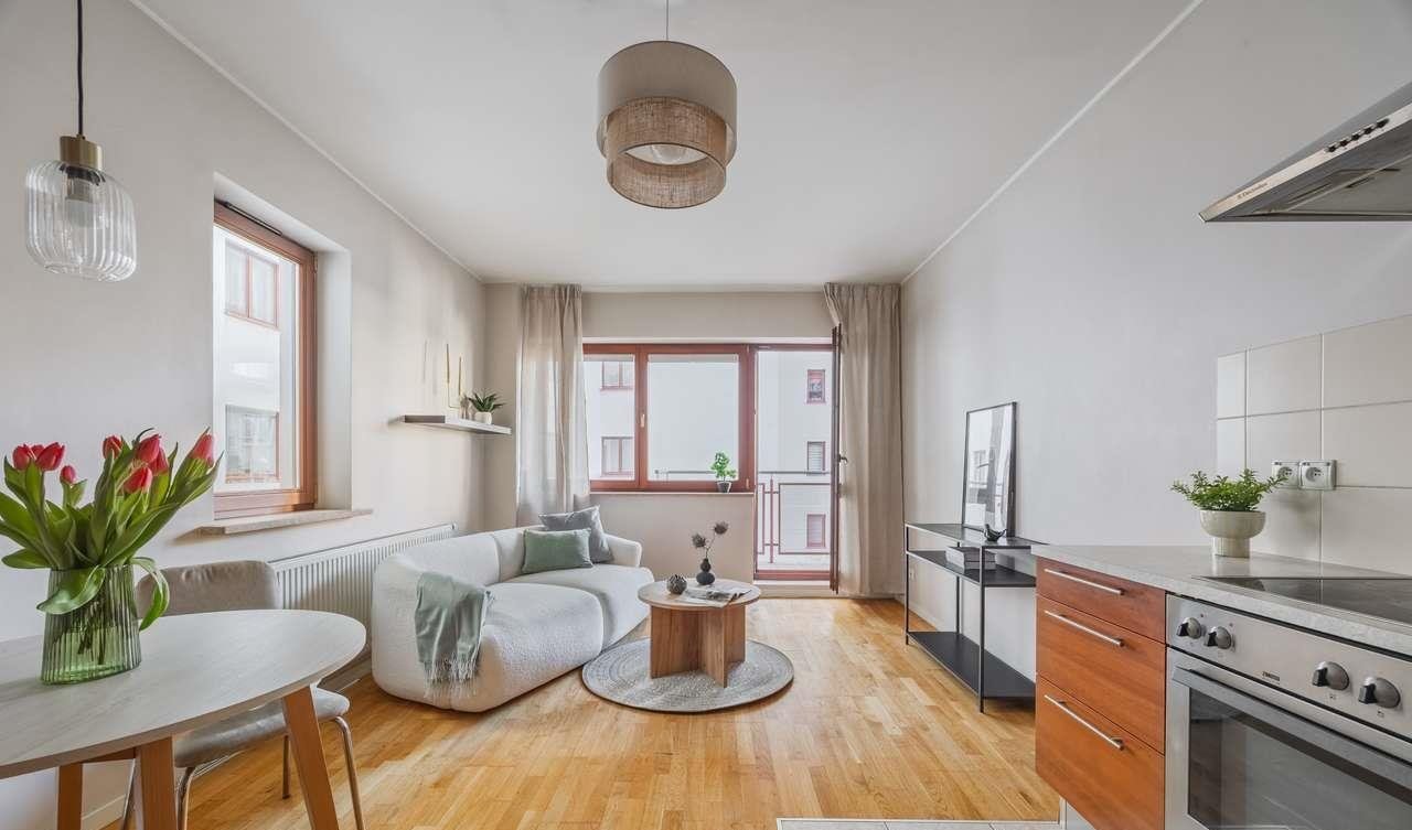 The flat stands out for its functional layout and excellent use of space. It is fully furnished and equipped with Zanussi appliances – ready to move into without any additional expenditure. The hallway features two spacious built-in wardrobes, providing convenient storage. The kitchen has been thoughtfully designed – it offers plenty of work space whilst maintaining a light and aesthetic feel.