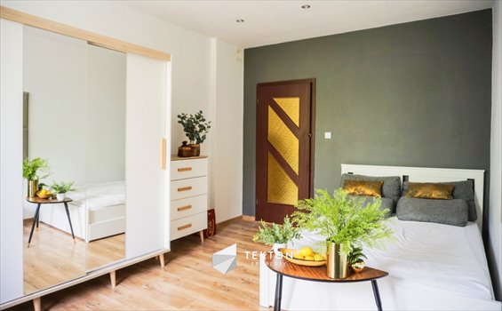 Mieszkanie dwustronnie otwiera się na piękną zieleń za oknem. Dzięki ekspozycji wschodnio-zachodniej mieszkanie cały dzień jest świetnie doświetlone. Znajduje się w nim kuchnia wyposażona w lodówkę, kuchenkę gazową, piekarnik, okap. Mieszkanie ma 2 pokoje, które daje wachlarz możliwości układu funkcjonalnego dopasowanego do potrzeb właścicieli. W każdym z pokoi znajduje się kanapa, łóżko, biurko oraz szafy do przechowywania. W korytarzu znajduje się duża szafa oraz pawlacze które pomieszczą wiele przedmiotów.
