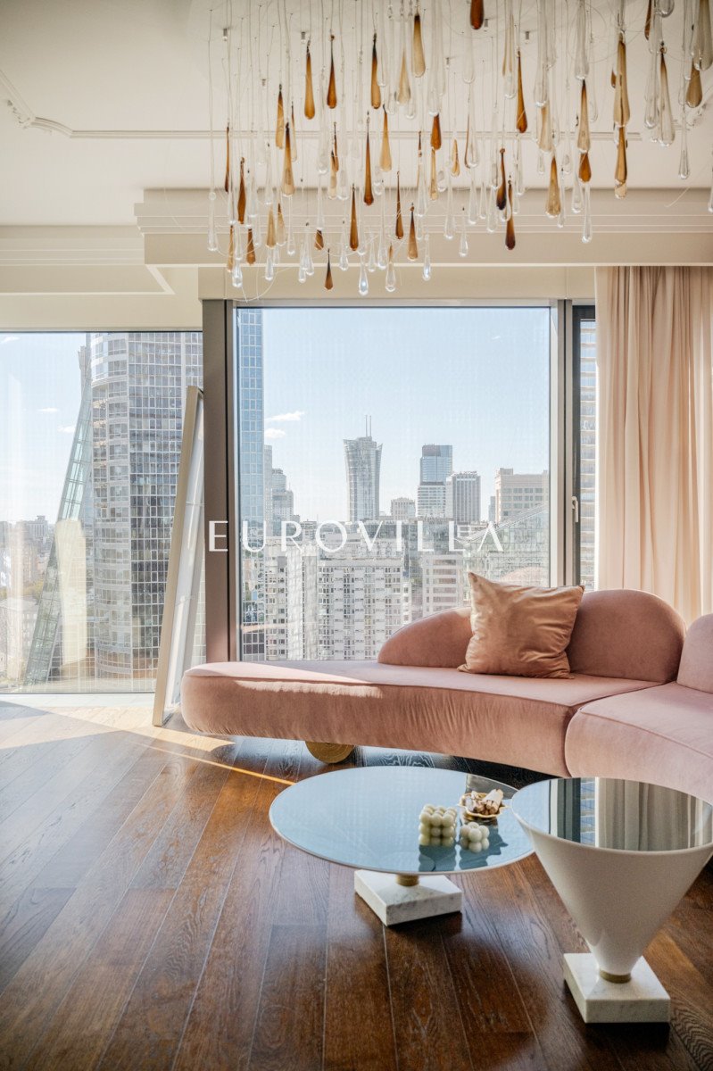 EUROVILLA prezentuje wyjątkowy, 2-pokojowy apartament w inwestycji Cosmopolitan. Nieruchomość zachwyca unikatowym wnętrzem, wykończonym z użyciem szlachetnych materiałów, m.in. włoskiego marmuru, onyksu oraz drewna wysokiej jakości. Dzięki przeszkleniom z apartamentu rozciąga się piękny widok na panoramę Warszawy.