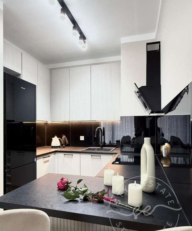 - otwarta na salon kuchni wyposażona w meble w zabudowie kuchennej, lodówkę z zamrażarką, płytę indukcyjną, piekarnik elektryczny, okap, zmywarkę, zlewozmywak, wyspę z 2 eleganckimi hokerami