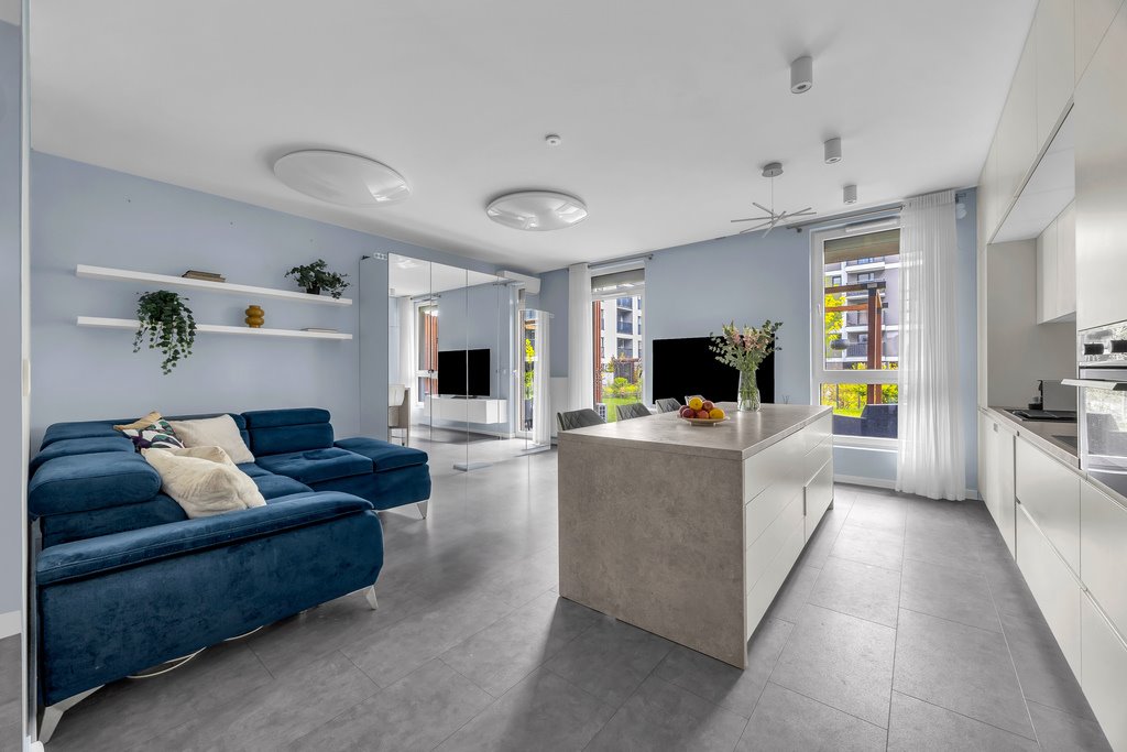 - przestronny salon z wyjściem do jednego z ogródków – idealnego na poranną kawę lub letnie wieczory
