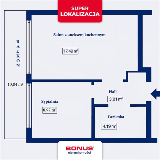 - Salon z aneksem kuchennym – 17,49 m², z wyjściem na zadaszony balkon / loggię – 10,04 m², o ekspozycji zachodniej, gwarantującej przyjemne popołudniowe światło.