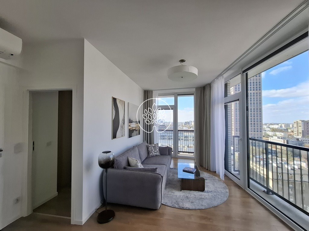 Duży pokój z ekspozycją zachodnią i północną oferuje nowoczesny, panoramiczny widok na Warszawę, zapewniony przez usytuowanie mieszkania na 13 piętrze. Efekt wzmacniają wysokie okna. Klimatyzacja.