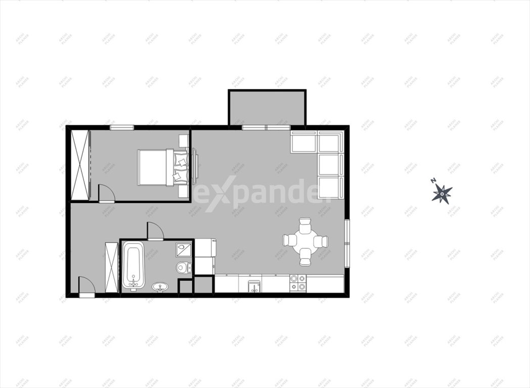 Istnieje możliwość zamknięcia kuchni oraz/lub wydzielenia sypialni.