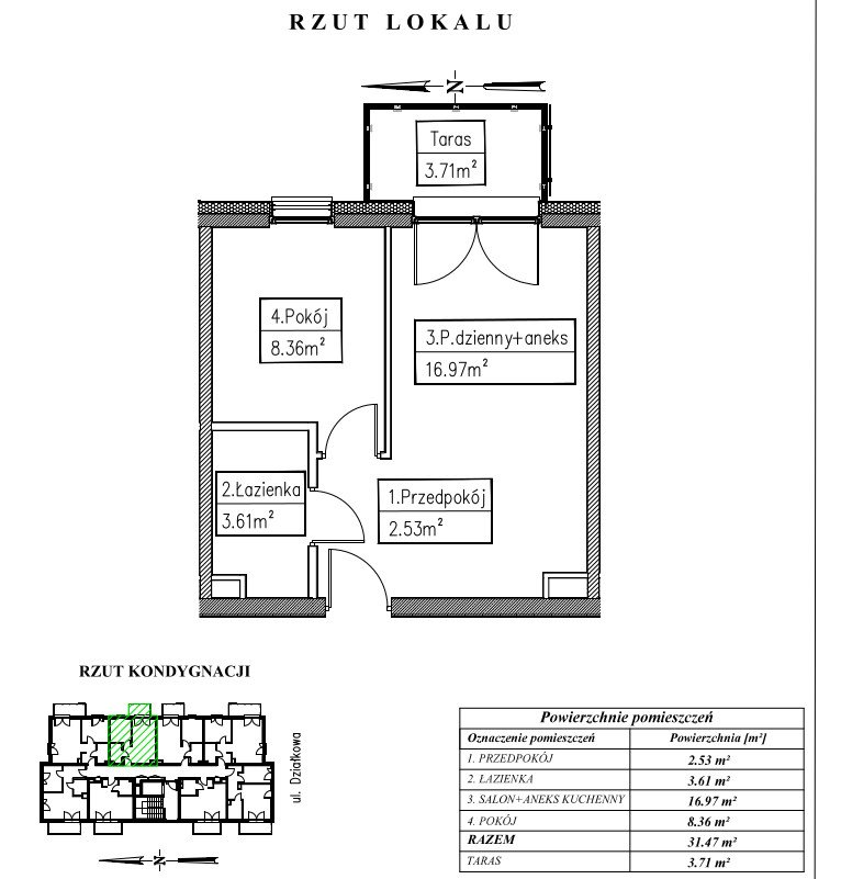Prezentowane mieszkanie ma powierzchnię 31,47m2 i znajduje się na pierwszym piętrze w pięciokondygnacyjnym budynku a jego główne cechy to- salon z aneksem kuchennym o powierzchni 16,97m2 z wyjściem na balkon o powierzchni 3,71m2, sypialnia o powierzchni 8,36m2, łazienka o powierzchni 3,61m2, przedpokój o powierzchni 2,53m2.