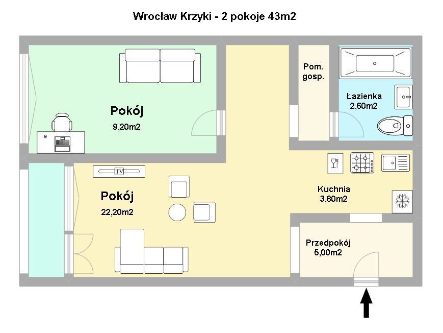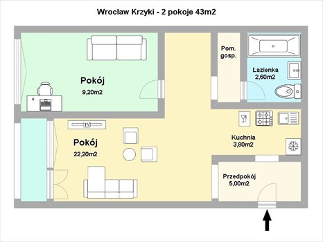 Dwupokojowe mieszkanie 43 m2 Wrocław, Krzyki, Południe, Gajowicka - 43,0m2