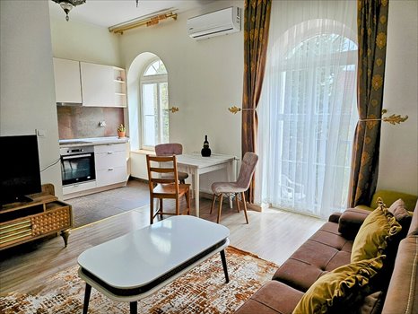 Standard i wyposażenie: mieszkanie o wysokim standardzie i własnym stylu, stan na gotowo do wprowadzenia, niewymagany żaden wkład finansowy. Mieszkanie kompletnie umeblowane i wyposażone tak jak na zdjęciach, ze sprzętem AGD i sanitarnym włącznie. Stolarka okienna PCV, stolarka drzwiowa drewniana, na podłodze w pokojach i częściowo w przedpokoju panele, w łazience i aneksie kuchennym i częściowo w przedpokoju płytki. W pokojach klimatyzacja. Domofon, brama wjazdowa na posesję na pilota.