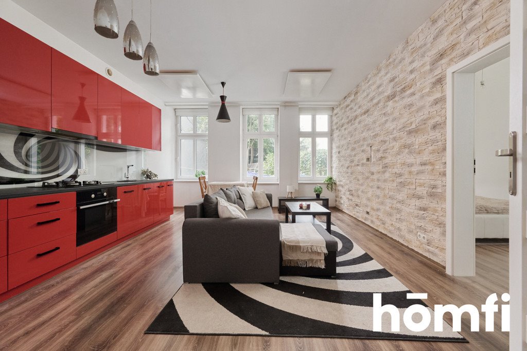 PROPERTY: For sale: a two-room 45.16 m² apartment, located on the elevated ground floor of a renovated tenement building. A spacious 5 m² basement belongs to the apartment – ideal for storing bicycles. The apartment is fully furnished, modernly designed, and ready to move in without any additional investment. High ceilings and stylish brick walls create a unique atmosphere. Large windows are an additional advantage. The apartment is heated with infrared panels. This offer is ideal for singles, couples, and investors looking for a rental apartment.