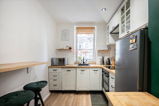 The apartment is located on the 1st floor of a 6-story building from the 1990s. It is modernly furnished, and all appliances are included in the transaction price. Each room has access to a separate balcony. The bright kitchen is built-in, custom-made, and equipped with household appliances such as an induction hob, oven, refrigerator, and dishwasher. The apartment windows and two balconies face west-north, overlooking the side street Prądzyńskiego, where there is minimal car traffic. The interior of the apartment is very well-maintained.