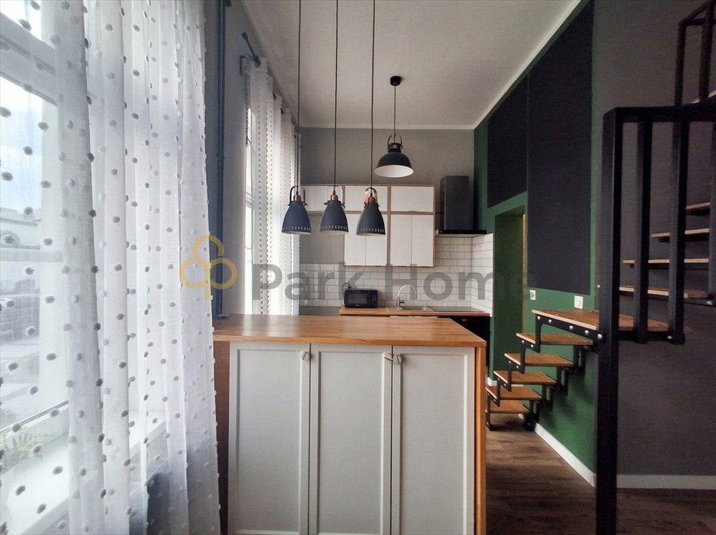 Mieszkanie wyróżnia się wysokością sufitów, co pozwoliło na stworzenie funkcjonalnej antresoli. Wnętrze urządzono w nowoczesnym stylu z elementami industrialnymi. Salon połączony z aneksem kuchennym przyciąga wzrok modną butelkową zielenią ścian oraz tablicową powłoką, która nadaje wnętrzu personalny charakter. Kuchnia wyposażona jest w eleganckie białe szafki, stylowe płytki typu "metro" oraz drewniane blaty, które ocieplają przestrzeń.
