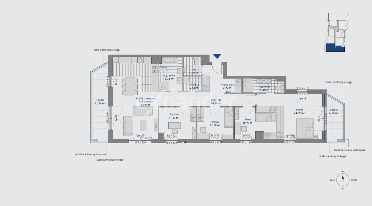 przestronny salon z aneksem kuchennym - ok. 34,9 m² z wyjściem na loggię (11,34 m²)