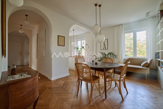 Mieszkanie cechuje się wysokiej klasy materiałami wykończenia wnętrz m.in blat kamienny z marmuru Rosa Atlantide, oświetlenie z naturalnego mosiądzu, kinkiet w kuchni Tom Dixon Stone Wall. Podłoga naturalna, dębowa. Oryginalne odrestaurowane drzwi. Meble wykonane na wymiar, fronty kuchenne zostały wykonane z płyty meblowej lakierowanej wraz ze sztukaterią. Armatura łazienkowa Villeroy & Boch. Projekt zrealizowany przez renomowane studio Raca Studio. Wysokość pomieszczeń 2,75 m.