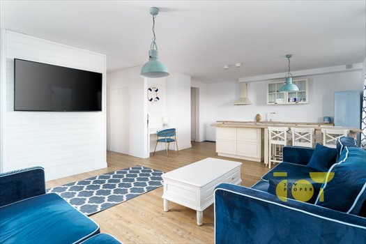 Oba apartamenty zaprojektowane są w przyjaznej nadmorskiej stylistyce, z dominującymi akcentami błękitu i granatu oraz starannie dobranymi meblami i dodatkami, które nadają wnętrzom przytulny charakter. Wyposażenie apartamentu obejmuje wysokiej jakości sprzęt AGD, w tym lodówkę, płytę grzewczą, zmywarkę i piekarnik, co czyni mieszkanie gotowym do zamieszkania lub wynajmu.