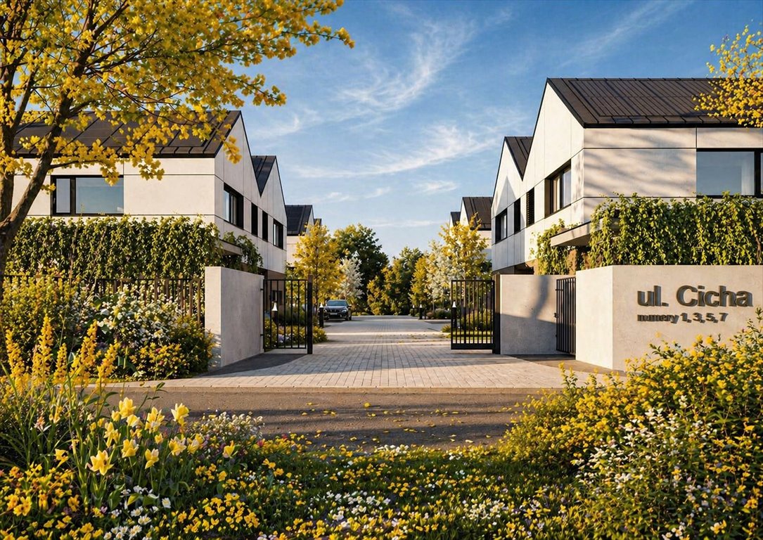 Teren inwestycji Cicha 1 stanowi zamkniętą, spójną przestrzeń zaprojektowaną z myślą o komforcie i bezpieczeństwie mieszkańców- całość jest ogrodzona, oświetlona oraz wyposażona w automatyczną bramę wjazdową i furtkę z systemem kontroli dostępu.