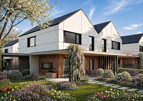 Niezależne wejścia do lokali oraz niska intensywność zabudowy zapewniają komfort i prywatność porównywalną z domem jednorodzinnym.