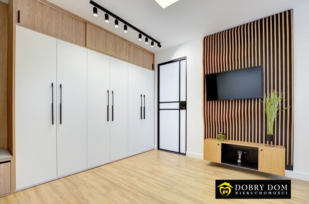 W cenie pozostaje zabudowa kuchenna ze sprzętem AGD: piekarnik, płyta indukcyjna, zmywarka, a także pralka i zabudowy szaf. Dodatkowym atutem jest wideodomofon.