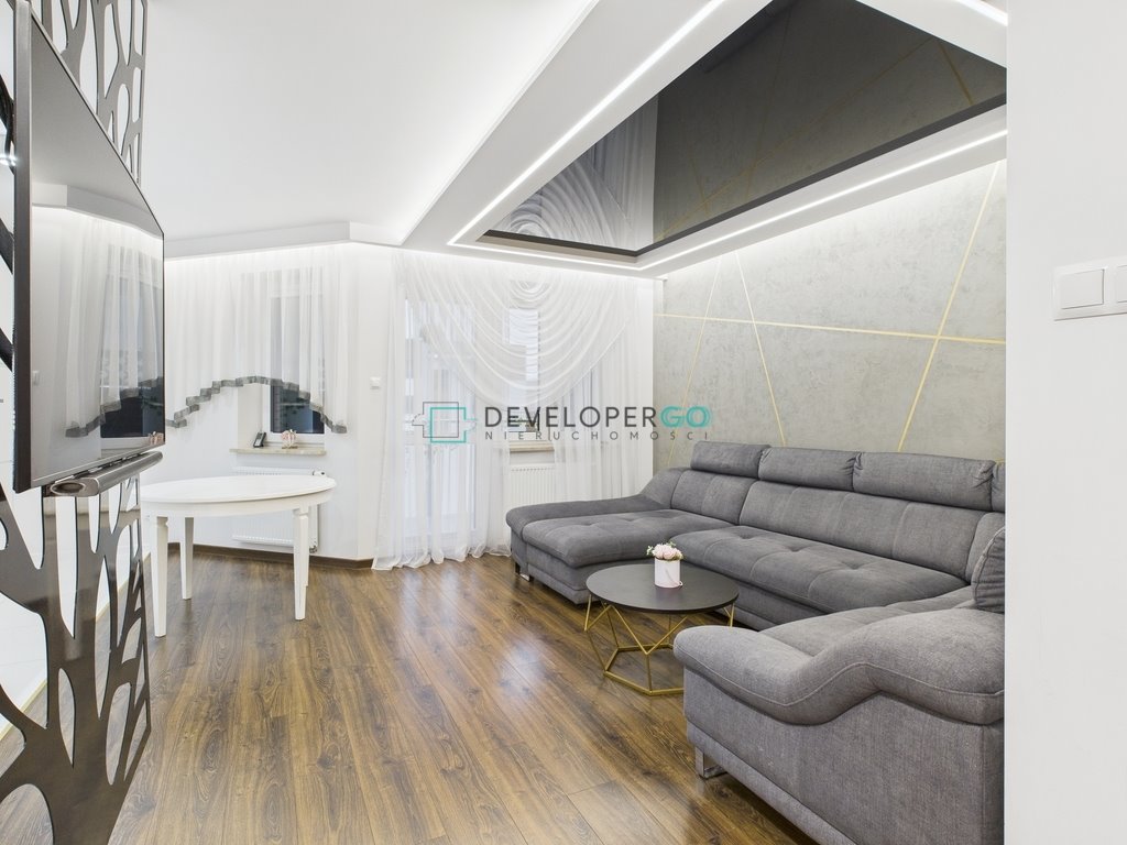 - Przestronny salon z aneksem kuchennym, wyjściem na balkon i napinanym sufitem,