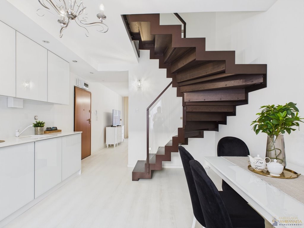 Wnętrze urządzone w spójnym, minimalistycznym stylu sprzyja odpoczynkowi po pracy. To dwupoziomowe mieszkanie wyróżnia stonowana, elegancka aranżacja oraz lokalizacja na ładnie zagospodarowanym, ogrodzonym terenie lubianego osiedla ( Wysoki Stoczek, ul. Kołłątaja ).