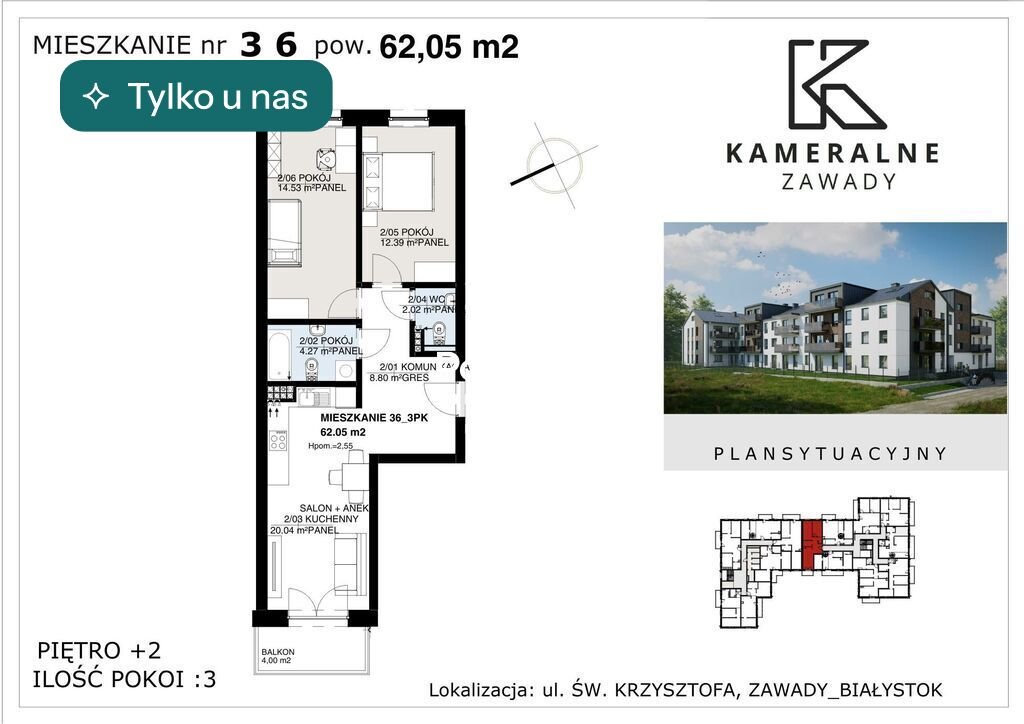 Nowoczesne 3-pokojowe mieszkanie z balkonem w Zawadach Białystok, Zawady - 62,05m2