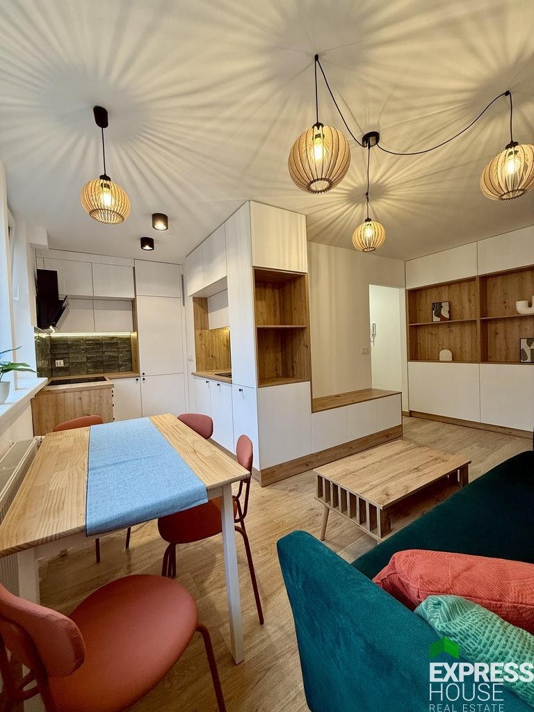 Apartament jest umeblowany i gotowy do zamieszkania od zaraz. Podczas remontu nie oszczędzano na materiałach oraz na wyposażeniu. W łączącym wszystkie pomieszczenia przedpokoju znajduje się wieszak na ubrania wraz z miejscem na buty. Po prawej stronie od wejścia ulokowano łazienkę wraz z wc i kabiną prysznicową, która jest wykończona w pięknym stylu. W salonie znajduje się piękny regał wraz z szafkami na cała ścianę, kanapa, szafka pod telewizor z zamykanymi półkami oraz stół i krzesła do codziennego spożywania posiłków.