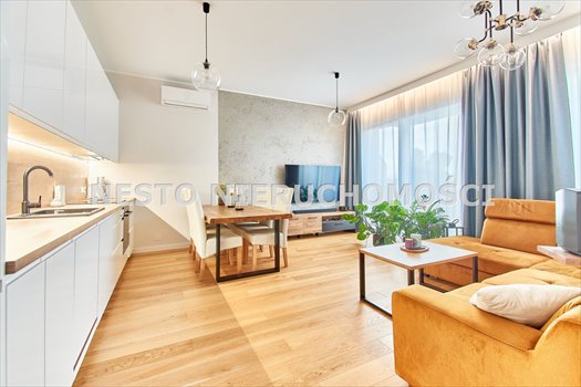 Mieszkanie zostało urządzone w bardzo wysokim standardzie , w jednolitym i spójnym stylu, gdzie dominują kolory szarości, biel i naturalnego drewna dębowego- takie połączenia daje odczucie ciepłej, przytulnej i domowej atmosfery panującej we wnętrzu nieruchomości.