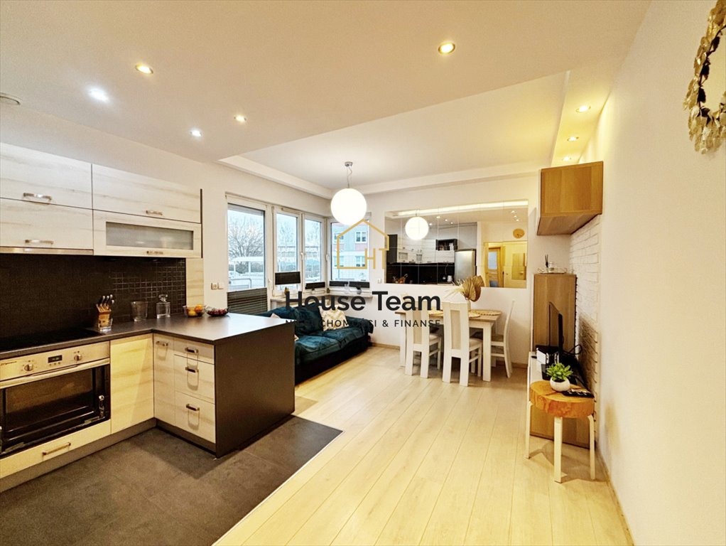 Sercem mieszkania jest jasny salon z aneksem kuchennym i wyjściem na balkon o powierzchni około 11 m2. Okna z ekspozycja na północ oraz zachód gwarantują równomierne, naturalne światło przez cały dzień, bez ostrych promieni słońca, brak przegrzewania wnętrza oraz komfortową temperaturę i przyjemny chłód w cieplejsze dni. To także gwarancja idealnych warunków do pracy, relaksu i oglądania telewizji. Salon oferuje miejsce zarówno na wygodny kącik wypoczynkowy, jak i część jadalnianą ze stołem i krzesłami - idealną do wspólnych posiłków. Dodatkowo wnętrze wzbogacono o lustra umieszczone na ścianach, które optycznie powiększają przestrzeń i nadają jej lekkości. Na uwagę zasługuje ściana telewizyjna wyłożona białą cegłą oraz podwieszane sufity z dużą ilością halogenów. Kuchnia została wyposażona w meble w zabudowie oraz pełny sprzęt AGD, w tym płytę indukcyjną, zmywarkę, piekarnik oraz lodówko-zamrażarkę. Komfortowa wyspa kuchenna zapewnia dodatkową przestrzeń do przechowywania oraz wygodne miejsce do przygotowywania posiłków.