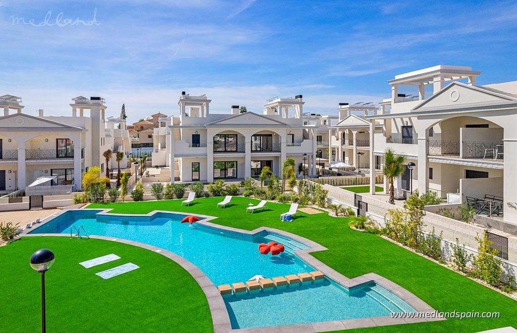 New residential complex with apartments and semi-detached villas in Ciudad Quesada, a residential area between the towns of Torrevieja and Guardamar. It is one of the most popular areas of the Costa Blanca South, only 15 minutes from the magnificent beaches of Guardamar and Torrevieja, and close to a wide selection of services and facilities. The area has its own golf course, a water park, hotels and a wide range of entertainment and dining venues. For outdoor sports enthusiasts, the La Mata Natural Park is only 5 minutes away, with various hiking and cycling paths around the salt lake. The A-7 motorway connects the area with other tourist areas, like Guardamar and Torrevieja, which are only 15 minutes away. Alicante International Airport is only 35 minutes away. This is the ideal location for those looking for a holiday home or for permanent living.The complex comprises modern homes in a beautiful Mediterranean style, all with 2-3 bedrooms and 2 bathrooms, and available in various models; apartments with a private garden, apartments with a private solarium, and two-storey semi-detached villas with a solarium and private garden. All models present an open plan lounge, kitchen and dining area, that opens onto a terrace. The master bedroom has an en-suite bathroom and opens onto a terrace. All properties include a parking space.The complex is completely closed and is designed around a wonderful community pool with an area for relaxation, and large garden areas.