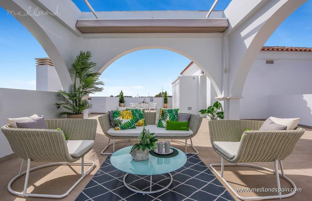 New residential complex in Doña Pepa, a popular residential area of Ciudad Quesada. The area is well established, with a full selection of large supermarkets, shops, bars, restaurants, a medical centre, and local and international schools. Outdoor enthusiasts have a wide choice of activities within a short drive, like golf courses, municipal sports facilities, a water park, and walking and cycling routes in the La Mata Natural Park. Not forgetting the fabulous beaches of Guardamar, La Mata, and Torrevieja all within 10 minutes' drive of the complex. The excellent road network makes it quick and easy to reach other towns and cities of the Costa Blanca. The airports in Murcia and Alicante are both less than an hours’ drive from the complex.The complex presents elegant homes with 2 or 3 bedrooms, in a choice of models: apartments with a private garden or a private solarium. All models present an open plan living area, combining the lounge, dining area and kitchen into a single space, with large windows that open onto a spacious terrace. The private garden and the solarium are perfect for enjoying the Mediterranean outdoor lifestyle.This is a completely closed complex, allowing residents to enjoy a fully secure and private experience. The community area is centrally located and includes a large pool and a beautiful garden area. There is an open parking area for the top floor apartments, while the other homes have a parking space on the private plot.